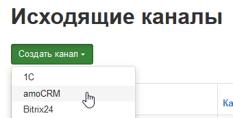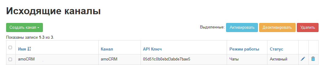 Готово. Канал amoCRM подключен по умолчанию в режиме «Чаты» и отображается в списке Исходящих каналов.